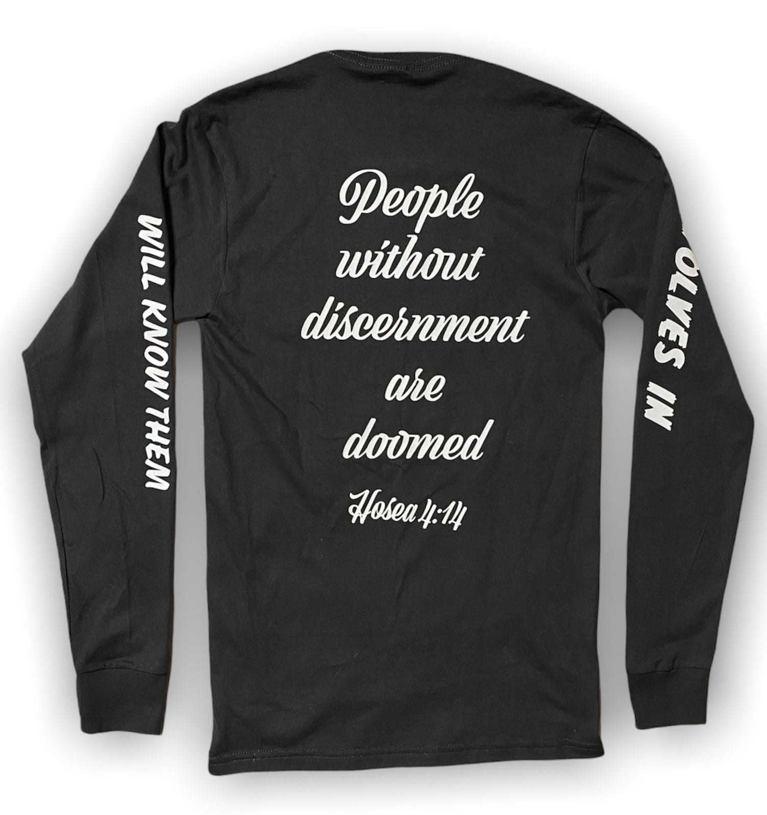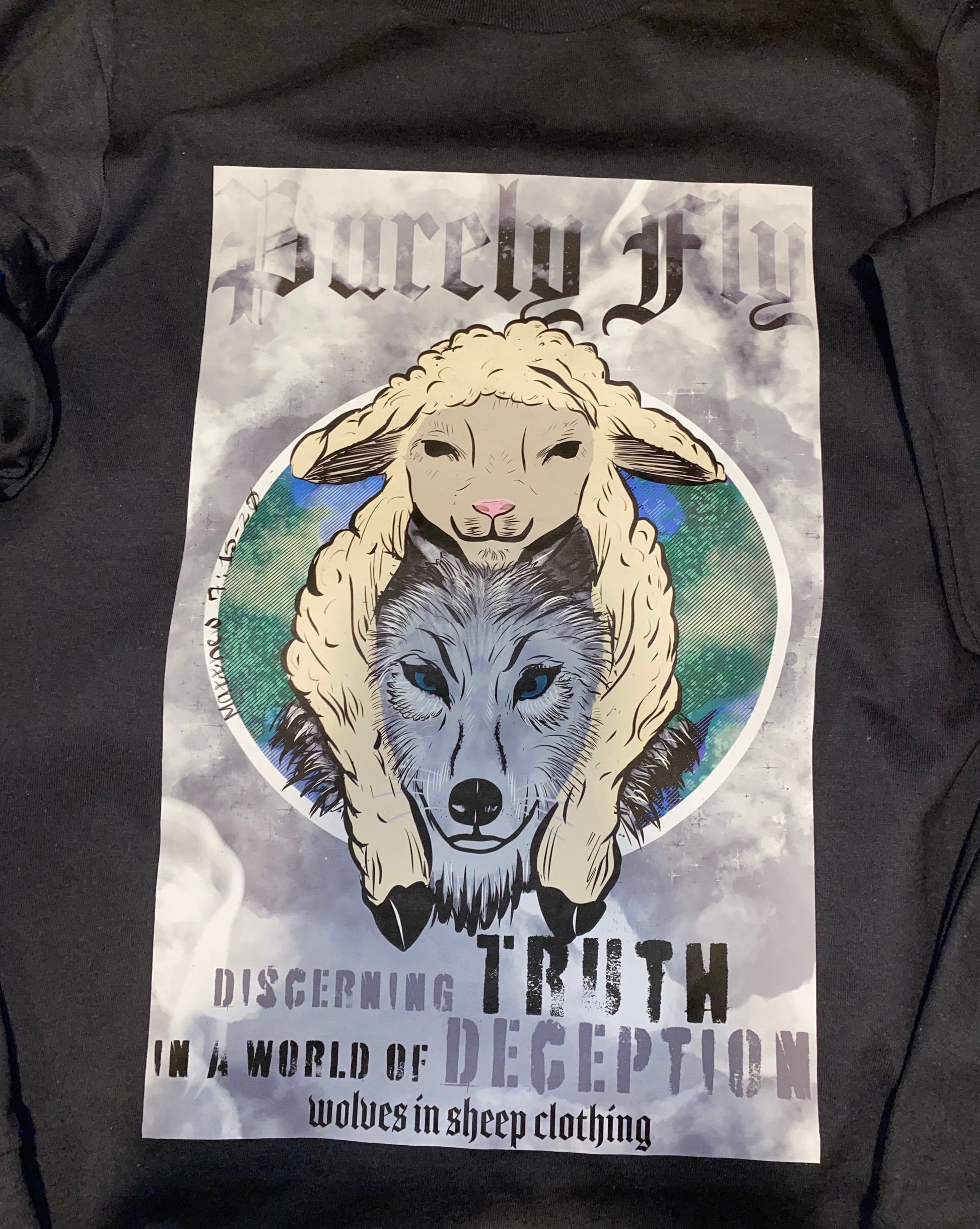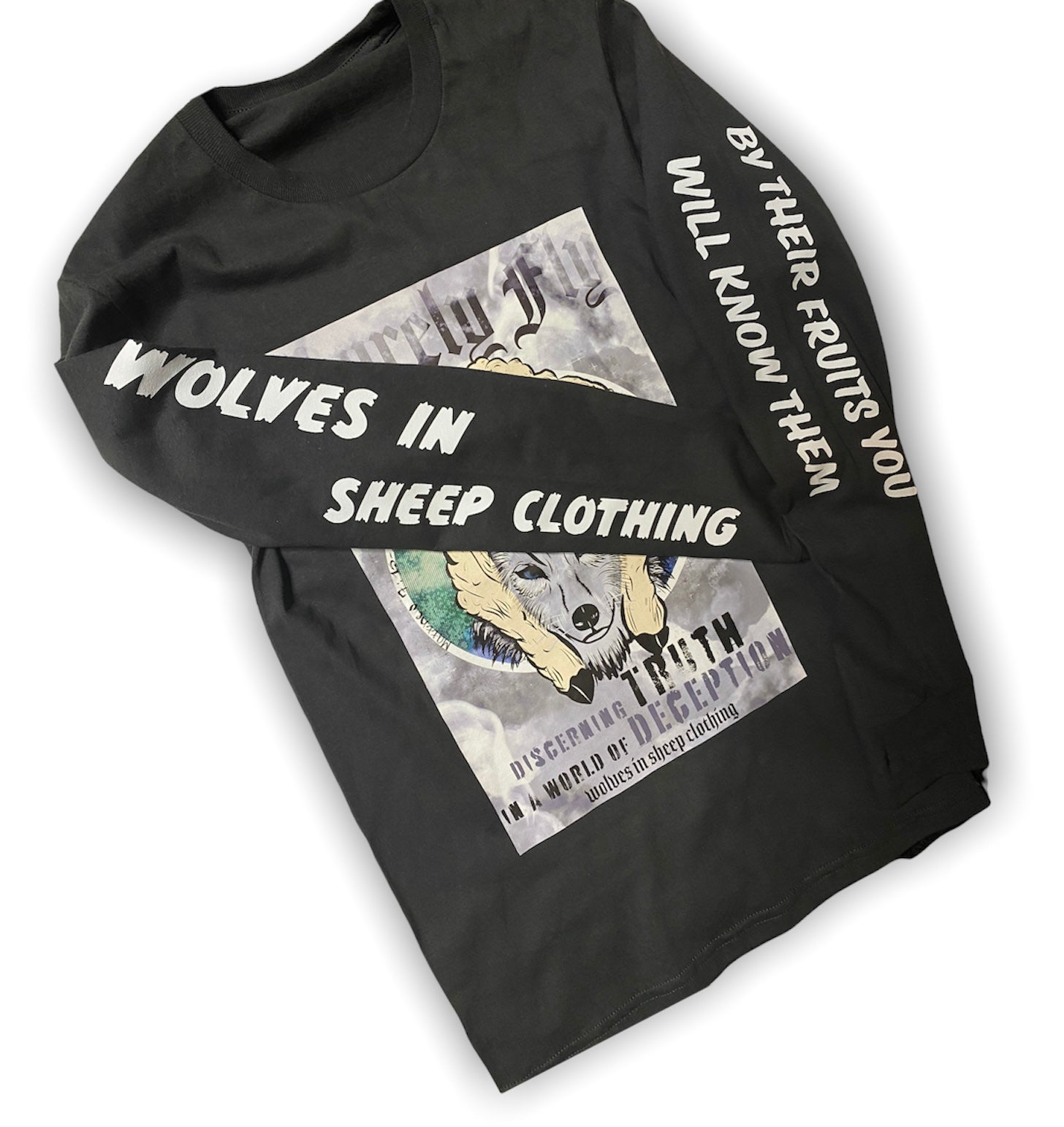 Design of wolf wearing a sheep clothing in front with scriptures on back and quoted on sleeves.